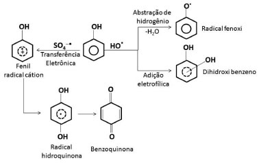 ![]() Figura 3. Diferenças mecanísticas observadas nas reações mediadas por radical sulfato e radical hidroxila