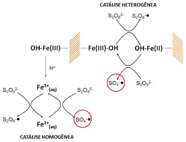 ![]() Figura 5. Representação das ativações hetero e homogênea de persulfato em processos mediados por óxidos de ferro