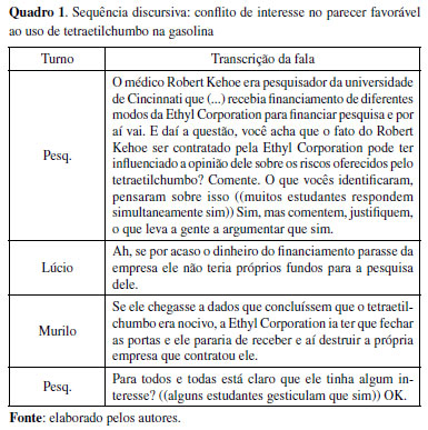 RESULTADOS E DISCUSSÃO Abordagem do caso histórico O caso histórico delineou a produção de duas substâncias químicas, o tetraetilchumbo e os clorofluorocarbonetos (CFCs), tendo como fonte o artigo de Viana e Porto, que foi lido previamente pelos estudantes.30 Essas substâncias foram produzidas sob circunstâncias e com propósitos diferentes na primeira metade do século XX, mas tiveram em comum a participação do engenheiro mecânico estadunidense Thomas Midgley, Jr. Para promover a discussão, questões foram introduzidas nos momentos apropriados da narrativa pelo pesquisador. As questões orientavam os estudantes para os seguintes problemas éticos: o conflito de interesses caracterizado no fato de um parecer favorável ao uso do tetraetilchumbo como aditivo para a gasolina ter sido emitido por um médico contratado pela própria indústria que produzia a substância; os riscos de se introduzir novas substâncias no ambiente, tendo em vista que os CFCs foram considerados ótimos fluidos para a indústria de refrigeração e como propelentes de aerossóis, não se vislumbrando durante décadas que esses compostos representavam riscos para a camada de ozônio; e como proceder em relação à produção e disseminação de substâncias químicas na sociedade e ambiente. O primeiro momento de discussão com os estudantes é apresentado na sequência discursiva mostrada no Quadro 1.