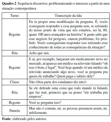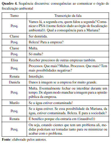 Independente de qual estratégia seja adotada para a liberação de novas substâncias, um estudante justificou, referindo-se às consequências das ações humanas sobre o ambiente, que "a gente vai alterar, a gente tem a capacidade para alterar, ainda mais que a gente sempre tá em desenvolvimento, então a gente vai acabar alterando, certo ou errado a gente vai acabar alterando" (LÚCIO). O reconhecimento da mudança do mundo material, causada pela atividade humana - não só científica - expressa por esse estudante, está de acordo com uma das principais compreensões que as aulas de ética química visam compartilhar. Diante disso, casos históricos que relatem os riscos e incertezas associados às substâncias químicas são importantes para sensibilizar os estudantes e provocar uma mudança de postura diante da produção e introdução de inovações por parte dos químicos. Nesse sentido, tais discussões não resultam apenas numa compreensão epistemológica mais elaborada sobre a Química - isso é, no nível das ideias, do pensar, etc. - mas, também, em bases para mudar a forma de agir no exercício da atividade química. Abordagem do caso hipotético Essa aula consistiu na discussão do caso hipotético "Próximo ao limite", elaborado pelos próprios autores (ver Material Suplementar). O caso hipotético apresenta duas partes: a descrição de uma situação relativa à atividade química; e questões para refletir sobre o caso. Na primeira parte, descreve-se uma situação na qual a química Mariana, trabalhando em um laboratório de análises ambientais, enfrenta um problema ético. A química suspeita que a qualidade da água da represa responsável por abastecer a população local está em risco, devido a efluentes da indústria química contratante dos serviços de seu laboratório. Seu superior argumentou que os testes realizados por ela ainda estão abaixo do limite estabelecido por órgãos de fiscalização ambiental e, também, que a realização de mais análises custaria tempo e dinheiro. Mariana terá que decidir o que fazer diante da situação. As questões que acompanham o caso hipotético visam: estimular os estudantes a pensarem em todas as possíveis decisões e ações que Mariana pode tomar, inclusive aquelas com que os estudantes não concordam; analisar as possíveis consequências para todas as ações imaginadas; e, por fim, tomar uma decisão. Os estudantes foram divididos em duplas ou trios, leram o caso hipotético, discutiram entre si cada uma das questões e escreveram suas respostas. Em seguida, cada grupo apresentou suas considerações para toda a sala. Ao longo da aula, o papel do pesquisador-docente foi aprofundar, complementar e apresentar outros pontos de vista em relação aos mencionados pelos estudantes. Inicialmente, as possíveis ações ou decisões foram comunicadas livremente pelos estudantes, incluindo tanto as decisões com que eles concordam quanto as com que não concordam, sem preocupação com a viabilidade de cada opção ou suas consequências. As seguintes ações ou decisões foram comunicadas: 1) não fazer nada; 2) contatar o órgão de fiscalização ambiental; 3) realizar as análises na empresa por conta própria, sem anuência do supervisor; 4) pedir demissão; 5) conversar com o chefe do supervisor; 6) procurar uma empresa concorrente para realizar as análises; 7) contatar a indústria química que seria a responsável pela contaminação da água; 8) conversar novamente com o supervisor; 9) falsificar os resultados; 10) comparar os resultados obtidos com os realizados por outros laboratórios; e 11) divulgar os dados para a mídia. O segundo momento da atividade teve como objetivo a avaliação das consequências de cada uma das opções comunicadas pelos estudantes. Por exemplo, quais as consequências para Mariana, a empresa e a sociedade no caso de ela não fazer nada em relação à situação descrita. Para isso, os participantes se basearam nas informações fornecidas pelo caso hipotético e, também, em seus próprios conhecimentos e experiências. A sequência discursiva mostrada no Quadro 4 retrata a avaliação das consequências da opção 2, contatar o órgão de fiscalização ambiental: