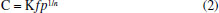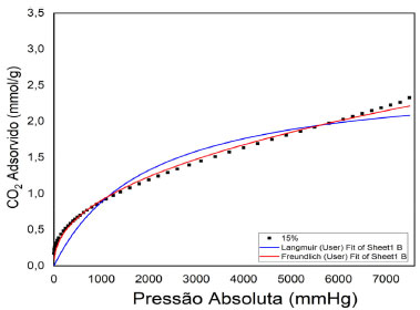 Os resultados de adsorção de CO2 obtidos a 25°C (melhor condição de adsorção) apresentaram as melhores capacidades de adsorção a 760 mmHg, na qual a amostra K15% apresentou a maior capacidade de adsorção (0,80 mmol/g) e uma melhor eficiência (0,60) em comparação a amostra K5%. Essa eficiência leva em consideração a estequiometria de 2 mol de N para 1 mol de CO2.7 A altas pressões ocorreu comportamento inverso, sendo o material KIT-6 a que apresentou valores mais significativos (3,3 mmol/g). Esse comportamento pode ser explicado pelo fato de pressões mais baixas favorecerem a adsorção química (quimissorção) realizada através dos materiais funcionalizados, enquanto pressões mais altas favorecem a adsorção física (fisissorção), tipo de adsorção que é mais acentuada no material puro, conforme descrito no estudo de Sanz et al.27 Resultados semelhantes foram obtidos por Aziz e colaboradores em 2012,28 em que eles determinaram que em baixas pressões o CO2 tende a quimissorver. Isso ocorre, pois, como descrito pelos autores, o CO2 quimissorvido apresenta valores de entalpia de adsorção próximos a 98 kJ mol-1 apresentando maiores valores. Enquanto o CO2 fisissorvido apresenta valores de entalpia de adsorção próximos a 35 kJ mol-1 em materiais de sílica mesoporosa. Como visto nas propriedades texturais (Tabela 1), o suporte KIT-6 apresentou maior área específica entre os adsorventes utilizados (603 m2/g), o que propicia maior área para captura das moléculas de CO2, pincipalmente, a altas pressões. Para os materiais híbridos a área foi, consideravelmente, reduzida, mas devido à presença das aminas, as interações químicas entre o CO2 e os grupos amino (quimissorção) são mais evidenciadas, principalmente a baixas pressões, e sofrem um aumento, embora não tão significativo quanto no suporte KIT-6 a altas pressões. Os resultados de adsorção de CO2 se mostraram bastante satisfatórios, pois se conseguiu uma boa capacidade de adsorção a baixa temperatura e pressão com um adsorvente com baixa concentração de amina impregnada. Outro resultado importante foi a capacidade de adsorção do material puro, mesmo a baixas pressões o material conseguiu adsorver quantidades semelhantes e até superiores a materiais do mesmo tipo relatados na literatura.2,11 Dessa forma, existem diferentes possibilidades, dependendo das condições de temperatura e pressão, que se deseja realizar a adsorção do CO2. Aplicação dos modelos de Freundlich e Langmuir A Tabela 3 apresenta os valores obtidos a partir dos modelos matemáticos de Freundlich e Langmuir, aplicados nas isotermas de adsorção de CO2, e a Figura 8 apresenta, de forma representativa, as isotermas da amostra K15% à 25 °C após os tratamentos matemáticos.
