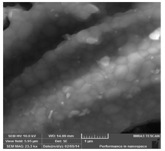 Nos resultados apresentados na Figura 3a, observa-se que, de uma forma geral, todas as amostras apresentaram isotermas do Tipo IV (a), que pode ser atribuída a materiais mesoporosos, com loop de histerese do Tipo H1. Isso demonstra que os materiais formados possuem poros unidirecionais e bem organizados, corroborando com os resultados de DRX aqui apresentados.4,11,22 Nota-se um decréscimo no volume total adsorvido e uma modificação no perfil da isoterma, quando comparados os materiais com 5 e 15%, o que está relacionado com a quantidade de amina inserida e ocorre devido à concentração de amina na superfície e nos poros dos materiais. Os resultados das isotermas reforçam os resultados já apresentados aqui de DRX e TGA em que foi possível observar uma leve desorganização do material a medida que se aumenta a quantidade de amina. Comportamento semelhante foi encontrado por Kishor e Ghoshal,11 ao funcionalizarem o KIT-6 com 3-aminopropiltrietóxisilano (APTES). Analisando os valores apresentados na Tabela 1, observa-se que o aumento na concentração de amina impregnada afetou de forma significativa as propriedades texturais dos materiais funcionalizados. Nota-se um comportamento decrescente nos valores da área específica, diâmetro de poros, volume total de poros e volume dos mesoporos primários. Essa correlação é um indicativo de que a amina impregnada está, não apenas na superfície, fora dos mesoporos primários, mas também dentro dos poros, visto que o volume de mesoporos diminui à medida que aumenta a % de amina. Como consequência da funcionalização tem-se o preenchimento total ou bloqueio dos microporos, como pode ser visto nos resultados de VMICRO, para todos os materiais funcionalizados. O aumento no valor do diâmetro modal de poro (DP) da amostra K5% pode ser explicado devido ao preenchimento parcial dos poros com amina, deslocando o perfil de distribuição para maiores valores do diâmetro de poros. Já para a amostra K15% o diâmetro foi de 5,3 nm, comportamento já esperado, pois uma maior quantidade de material foi inserido no suporte diminuindo seu tamanho e, consequentemente, também, a área e o volume de poros, resultados semelhantes podem ser vistos na literatura.11,23 MEV A Figura 4 apresenta, de forma representativa, a imagem de MEV do suporte KIT-6.