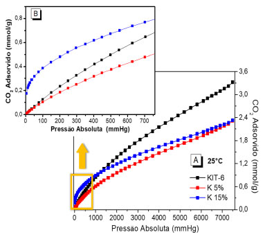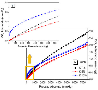 ![]() Figura 6. a) Isotermas de adsorção de CO2 do suporte KIT-6 e dos materiais híbridos a 35 °C; b) em destaque a adsorção em baixas pressões