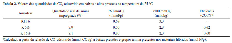Ao observar as isotermas de adsorção de CO2 em diferentes temperaturas, nota-se que os testes realizados a 25 °C apresentaram os melhores resultados a baixa e a altas pressões, apresentando adsorções de 0,80 mmol/g em 760 mmHg até 3,3 mmol/g em 7500 mmHg. Os resultados obtidos a 35 °C e a 50 °C, apresentaram comportamentos semelhantes, entretanto, obtiveram-se valores de adsorção consideravelmente inferiores. Esses resultados evidenciam que a temperatura de 25 °C é a melhor temperatura de adsorção de CO2 para os adsorventes utilizados. Resultados semelhantes foram encontrados por Heydari-Gorji e Sayari,26 ao trabalharem com Polietilenamina (PEI). Os autores afirmam que temperaturas mais baixas favorecem a adsorção de CO2 em materiais com baixa concentração de amina inserida (como é caso das concentrações utilizadas nos testes deste trabalho). A baixa concentração de amina propicia uma melhor dispersão da mesma sobre o material, tornando os locais de adsorção mais facilmente acessíveis, pois, devido à natureza exotérmica da interação entre o CO2 e a amina não são necessárias temperaturas muito altas para promover tal reação. Corroborando com esse comportamento, os resultados observados a 35 e 50 °C mostram que a quantidade de CO2 adsorvida sofre um decréscimo significativo. A Tabela 2 apesenta as quantidades de CO2 adsorvido nos materiais híbridos a baixa e a altas pressões, em função da quantidade real de amina impregnada.