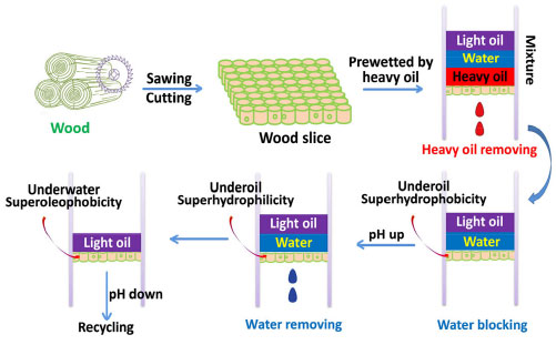 ![]() Scheme 1. Preparation of the wood slice for the separation of light/water/heavy oil/water triphase mixtures