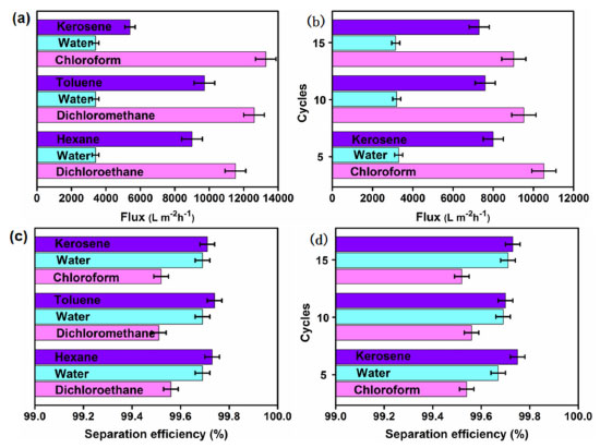 Considering the variable composition of oils, a variety of light oil/water/heavy oil mixtures, including kerosene/water/chloroform, toluene/water/dichloromethane and hexane/water/dichloroethane mixtures, were separated successfully with the treated slice. Figure 4a shows the flux of the treated slice for three types of light oil/water/heavy oil mixtures. The flux of heavy oils (chloroform, dichloromethane, dichloroethane) was higher than that of light oils (kerosene, toluene, hexane). Taking a kerosene/water/chloroform mixture as an example, the separation flux at different separation cycles are provided in Figure 4b. The separation flux of water slightly decreased from 3400 to 3150 L m-2 h-1 after being recycled 15 times due to oil pollution of the slice. This indicated that the separation flux of the slice could be 93% recovered by simply washing with ethanol and drying. Therefore, it can be easily reused. As displayed in Figure 4c, the separation efficiency of all three oil/water mixtures was above 99.5% for both water and oil removal, thus exhibiting excellent separation properties. Taking the kerosene/water/chloroform mixture for example, the effect of separation cycle on the separation efficiency of the slice is shown in Figure 4d. The separation efficiency remained fairly high (>99.5%) in 15 cycles for the mixture, which possessed good light oil/water/heavy oil separation reusability.