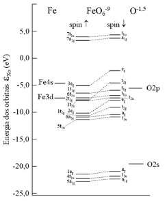 ![]() Figura 1. Energias (em eV) dos orbitais vazios de menor energia (7t1u ↑, 7a1g ↑, t1u ↓, a1g ↓, eg ↓ e t2g ↓) e orbitais de valência ocupados para o cluster octaédrico FeO69-, calculados por Tossell et al.36 Adaptado da referência 36