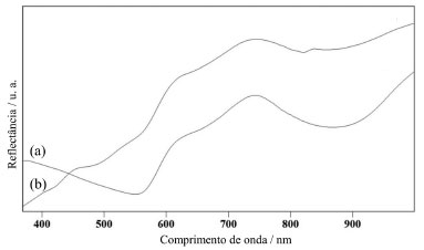 ![]() Figura 2. Espectros de reflectância difusa no Vis-NIR de hematita sintética: (a) mistura mecânica de hematita com BaSO4 e (b) espectro do traço feito sobre papel. Para maiores detalhes ver referência 44