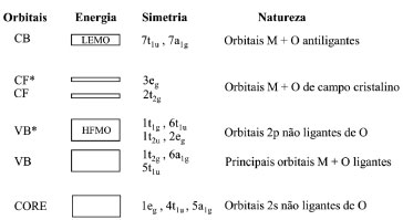 ![]() Figura 3. Diagrama generalizado dos níveis de energia dos orbitais moleculares de íons coordenados octaedricamente ao oxigênio. As larguras de banda e energias relativas são as indicadas, mas variam de íon para íon. Adaptado da referência 45