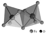 ![]() Figura 4. Configuração face-sharing de dímeros octaédricos Fe2 O9 . Adaptado da referência 47