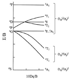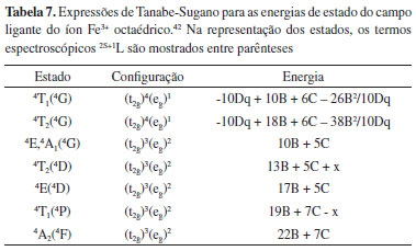 Na aproximação da teoria do campo ligante, as energias dos estados são expressas em termos de três parâmetros: 10Dq, B e C, onde os parâmetros Racah B e C de campo ligante são medidas da energia de repulsão envolvidas no desdobramento dos orbitais t2g e eg.42 As energias desses estados para o Fe3+ em coordenação octaédrica (Oh) são mostradas esquematicamente no diagrama de Tanabe-Sugano, na Figura 5, e foram calculadas pelos autores como uma função de 10Dq (considerando B e C constantes) a partir das expressões de Tanabe-Sugano42 (Tabela 7).