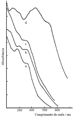 ![]() Figura 6. Espectro de absorção no visível e ultravioleta de (a) goethita, (b) lepidocrocita, (c) maghemita e (d) hematita. Adaptado da referência 42