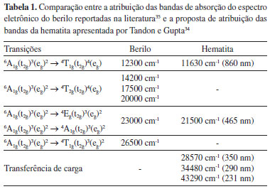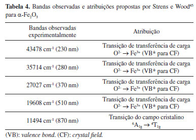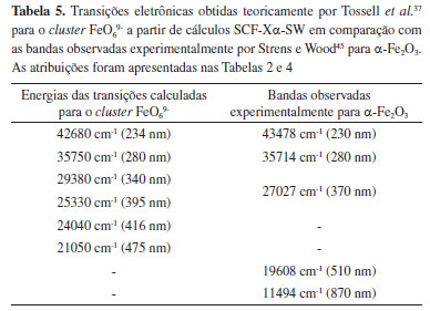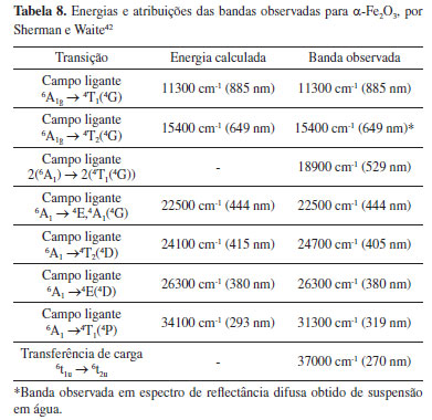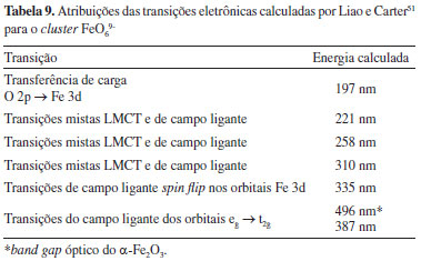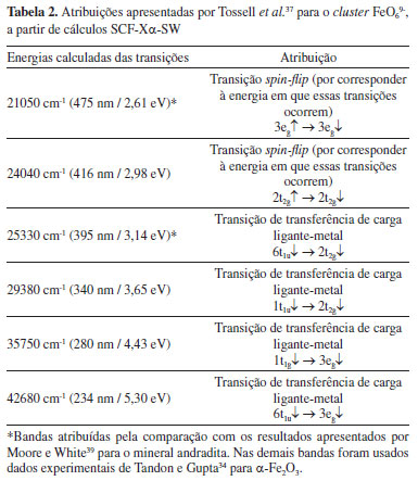 No que diz respeito aos cálculos utilizando o método SCF-Xα-SW, os resultados apresentados permitiram a atribuição das transições de transferência de carga (LMCT) de mais alta energia, que ocorreriam a partir dos orbitais moleculares não ligantes (1t2u, 6t1u e 1t1g), localizados nos átomos de oxigênio, para os orbitais antiligantes t2g do Fe (3d). A partir disso, determinou-se que as energias das transições LMCT (6t1u → 2t2g e 1t1g → 2t2g) corresponderiam a 38100 e 43600 cm-1 (aproximadamente 262 e 229 nm), respectivamente. Uma compilação das energias calculadas das transições LMCT e de campo ligante38 e das atribuições feitas a partir da interpretação dos espectros experimentais da hematita42 são mostradas na Tabela 8.