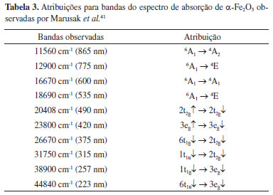 São notáveis as diferenças entre as atribuições realizadas por Sherman e Waite42 para as transições eletrônicas da hematita em relação às apresentadas em estudos anteriores, principalmente pelo fato de que segundo os estudos de Sherman e Waite as transições de campo ligante dominariam o espectro eletrônico da hematita, de aproximadamente 290 nm até o infravermelho próximo (NIR) sendo, portanto, as responsáveis pela cor característica do α-Fe2O3. Além disso, chama a atenção a previsão de que as transições LMCT estariam restritas à porção ultravioleta do espectro de absorção da hematita, abaixo de 280 nm. Defeitos estruturais e o espectro de absorção no visível Em 1999, Galvez et al.48 publicaram um estudo visando a investigação das propriedades da hematita contendo fósforo (P) estrutural. Tomando como referência as atribuições apresentadas por Sherman e Waite,42 os autores identificaram no espectro eletrônico de hematitas sintéticas novas bandas em 425-435 nm e em 488 nm, afirmando que estas seriam bandas típicas de goethita (α-FeOOH), em concordância com a atribuição da literatura para este mineral (transições 6A1 → 4E4A1(4G) e 2(6A1) → 2(4T1(4G)), respectivamente).42 Embora análises de difratometria de raios X (XRD) realizadas não tenham detectado a existência de fase α-FeOOH na estrutura cristalina das hematitas sintetizadas, os autores sustentaram a hipótese de que a presença de tais bandas seria devida à existência de sítios com geometria similar à do mineral goethita, interpretados como defeitos resultantes da presença de grupos OH no interior da estrutura cristalina das partículas e em sua superfície, incorporados durante a síntese.48 A presença de hidrogênio ligado ao oxigênio não permitiria que a ligação com Fe fosse estabelecida, gerando um defeito estrutural em relação à estrutura esperada para a hematita. Para comprovar essa hipótese, os autores analisaram a variação na intensidade da banda em 488 nm em relação à intensidade de uma banda típica de hematita em aproximadamente 538-574 nm 2(6A1) → 2(4T1)43 conforme se aumentava o conteúdo de OH. O ganho de intensidade proporcional à incorporação de OH na estrutura verificado para a nova banda em 488 nm sustentou o argumento de que ela estaria relacionada a espécies OH e, portanto, ao aparecimento de uma componente óptica "do tipo goethita".48 Apesar de se tratar de hematitas sintéticas produzidas a partir de um protocolo específico de síntese que é planejado para gerar defeitos na estrutura cristalina, as observações relatadas por Galvez et al.48 chamaram a atenção para a complexidade do espectro eletrônico do α-Fe2O3, reforçando a hipótese de que as variações observadas nos espectros eletrônicos possam estar relacionadas à ocorrência de defeitos na estrutura cristalina e, principalmente, questionando em que grau a presença desses defeitos poderia contribuir para a cor da hematita. Transições eletrônicas na hematita e contradições na abordagem da teoria do campo ligante Pailhé et al.,49 em um estudo publicado em 2008, apontaram contradições na abordagem de campo ligante na descrição das transições eletrônicas da hematita.38,42 Para construir seus argumentos, os autores comparam o espectro Vis-NIR de α-Fe2O3 com óxidos AFe2O4 (A=Mg, Zn) com estrutura do tipo espinélio. Seus principais questionamentos são apresentados a seguir. Primeiramente, o aumento da intensidade das transições de campo ligante devido ao acoplamento de spin magnético entre os íons Fe3+-Fe3+, conforme proposto por Sherman38 e Sherman e Waite,42 foi questionado a partir da comparação do espectro Vis-NIR da hematita com o de um composto anti-ferromagnético (MgFe2O4) e com um composto paramagnético (ZnFe2O4), verificando que as bandas de absorção intensas ocorrem com aproximadamente a mesma intensidade para todos os compostos analisados.49 O segundo argumento apresentado pelos autores consiste na conhecida maior probabilidade com que as transições de transferência de carga 2p(O2-) → 3d(Fe3+) tendem a ocorrer na região do visível em relação às transições interatômicas d-d,49 questionando a predominância das transições de campo ligante nessa região espectral, proposta por Sherman e Waite.42 Finalmente, como último argumento, os autores destacaram o fato, relatado na literatura, de que hematita exibe termocromismo reversível, variando do marrom avermelhado ao preto com o aumento da temperatura, um comportamento geralmente associado a transições de transferência de carga e não a transições d-d.49 Um esclarecimento importante é que o termocromismo reportado pelos autores não foi encontrado na literatura, apesar de busca cuidadosa ter sido realizada. A partir desses argumentos, os autores alegaram que o espectro de absorção da hematita seria majoritariamente dominado por transições LMCT, com as posições de banda determinadas experimentalmente por meio de curvas derivadas do espectro de reflectância difusa Vis-NIR, em 587 e 709 nm.49 Apesar das discordâncias com a abordagem do campo ligante para a explicação das transições dominantes no espectro eletrônico da hematita, as demais bandas observadas em 640 nm e 860 nm foram atribuídas a transições de campo ligante em concordância com as atribuições realizadas por Sherman e Waite (1985),42 correspondendo às transições 6A1(6S) → 4T2(4G) e 6A1(6S) → 4T1(4G), respectivamente. Para todas as atribuições apresentadas os autores utilizaram resultados previamente observados na literatura,49 relacionando com os espectros de reflectância difusa na região do visível obtidos experimentalmente para os óxidos de ferro investigados. Ainda questionando a predominância de transições de campo ligante no espectro de absorção da hematita, é relevante citar o estudo apresentado por Chernyshova et al.50 a partir de medidas de espectroscopia de absorç