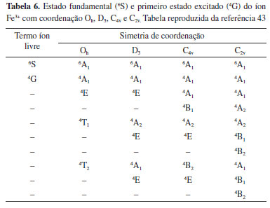 A aproximação entre os átomos, gerada pela distorção, aumenta a polarização de spin do oxigênio que conecta as faces do poliedro, o que gera uma interação de supertroca (superexchange, polarização das funções de onda do oxigênio na presença de íons magnéticos Fe3+) que, por sua vez, leva a um acoplamento magnético consideravelmente mais forte do que seria esperado em outras geometrias.42 Como resultado, dependendo dos estados eletrônicos do íon Fe3+ em geometria face-sharing, algumas transições de campo ligante poderão ser muito intensificadas em relação a outras.42 A partir do tratamento teórico apresentado, os autores propuseram que o espectro eletrônico de óxidos de Fe3+ seria dominado por três tipos de transições: transições de campo ligante do íon Fe3+; transições de transferência de carga ligante-metal e, por último, transições que resultam de excitações simultâneas envolvendo orbitais do cátion Fe3+ de sítios adjacentes magneticamente acoplados.42 Como já mencionado anteriormente, Sherman e Waite42 partiram do modelo do campo cristalino para explicar as transições observadas, reservando a abordagem da teoria do orbital molecular (SCF-Xα-SW), para tratar as transições de transferência de carga que, de acordo com os autores, seriam mais facilmente descritas em termos dessa teoria. Com o desdobramento do campo cristalino do íon Fe3+ em coordenação octaédrica, as diferentes possíveis configurações eletrônicas dos orbitais t2g e eg dão origem a diferentes estados entre os quais podem ocorrer transições eletrônicas.42 A Tabela 6 apresenta os estados para o Fe3+ em coordenação com simetria Oh (característica de α-Fe2O3), D3, C4v e C2v para o estado fundamental (6S) e primeiro estado excitado (4G). A notação que define os estados é baseada na combinação do termo espectroscópico 2S+1L com uma das diferentes simetrias possíveis para o campo cristalino dos orbitais atômicos 3d do metal, onde 2S+1 é o momento magnético do spin total e L corresponde ao momento angular nos sistemas multieletrônicos.