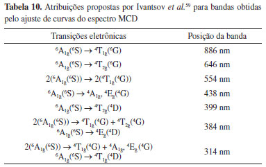 É importante destacar algumas comparações entre as atribuições apresentadas por Tossell et al.37 e Strens e Wood,45 uma vez que estes últimos fizeram uso dos diagramas de energia dos orbitais moleculares obtidos por Tossell et al.37 porém, introduzindo outros critérios para obter a energia das transições, como destacado anteriormente. Curiosamente, as bandas calculadas e atribuídas por Tossell et al.37 a transições de campo cristalino spin-flip (475 e 416 nm) não foram observadas por Strens e Wood,45 da mesma forma que a única banda observada e atribuída a uma transição do campo cristalino por Strens e Wood45 (870 nm, atribuída à transição 6A1g → 4T1g) não foi calculada por Tossell et al.37