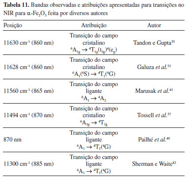 Abordagem similar, com a análise comparativa de resultados de espectroscopia de dicroísmo circular magnético (MCD) e de absorção no UV-Vis, foi usada por Mizuno e Yao60 para investigar a dependência das propriedades ópticas da hematita com o tamanho e forma de partícula. Nesse estudo, a observação da variação de intensidade das bandas nos espectros MCD e de absorção no UV-Vis permitiu aos autores correlacionarem a diminuição do tamanho de partícula com a diminuição do acoplamento magnético Fe3+-Fe3+. Os autores mostram, ainda, que a formação de agregados exerce um efeito similar ao aumento do tamanho de partícula, estando ambos relacionados à diminuição da intensidade da borda de absorção em torno de 450-470 nm. Essa observação corrobora os resultados apresentados anteriormente por Torrent e Schwertmann,24 e sugere que a presença de agregados seja um fator importante na avaliação das propriedades ópticas da hematita, o que ainda carece de investigações aprofundadas. De maneira geral, nota-se que o maior interesse dos estudos acima discutidos se encontra centrado na discussão da natureza do band gap óptico da hematita. Chamam a atenção as atribuições a transições de transferência de carga apresentadas nos estudos que empregaram os métodos CASSCF, CASPT2, GW, fotoemissão, espectroscopia Auger e CI, as quais estão em desacordo com os resultados obtidos por espectroscopia magneto-óptica (Ivantsov et al.)59 que confirmam os resultados obtidos anteriormente pelo método SCF-Xα-SW42 em relação à predominância das transições de campo ligante em toda a região do espectro visível para a hematita. As transições eletrônicas no NIR Quanto à investigação das transições na região do infravermelho próximo (NIR) do espectro eletrônico da hematita, a atribuição de bandas observadas acima de 800 nm tem sido pouco discutida na literatura, possivelmente devido ao crescente interesse no estudo das propriedades de semicondutor desse óxido de ferro, o que faz com que as investigações tendam a se concentrar na região visível do espectro eletromagnético. Convém recordar as atribuições das transições no espectro eletrônico do α-Fe2O3 na região do NIR dadas pelos diferentes autores aqui discutidos. Em todos os casos há concordância que correspondem a transições do campo ligante (ou campo cristalino, como nomeado por alguns autores), conforme apresentado na Tabela 11.