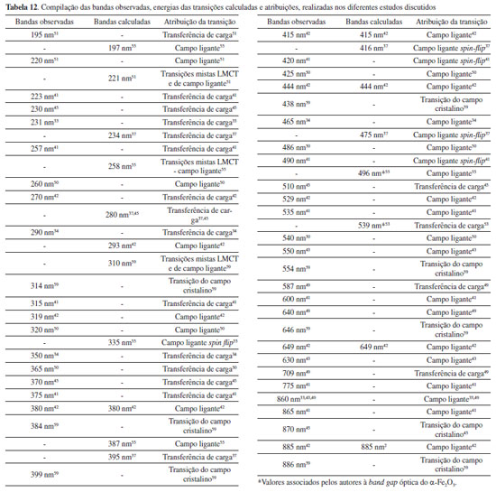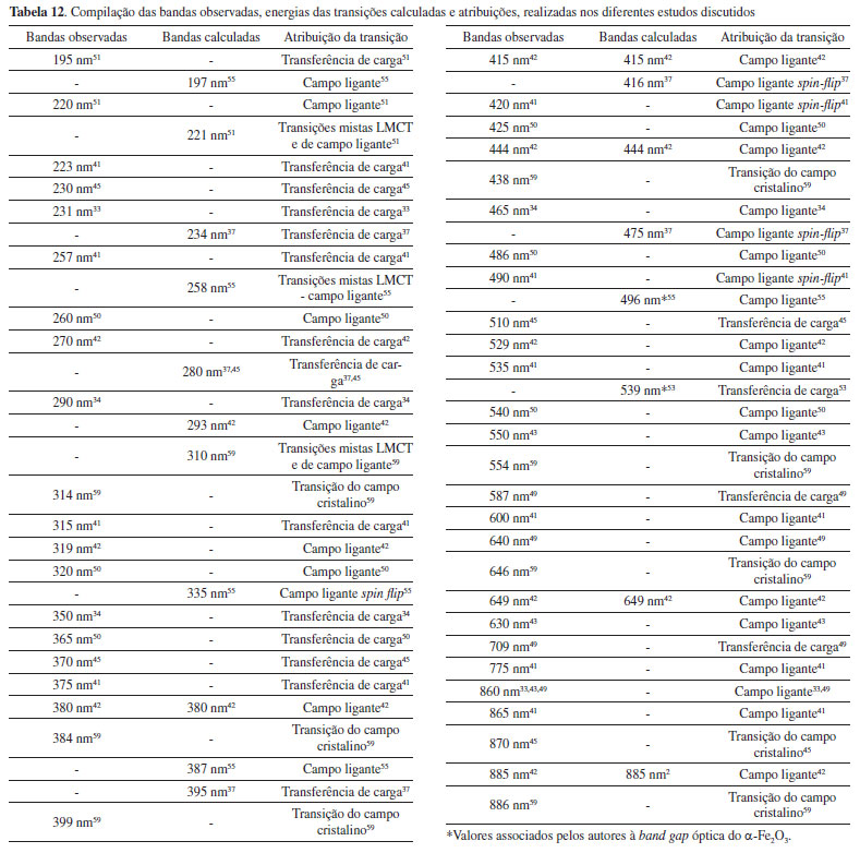 CONCLUSÕES A discussão dos diferentes modelos apresentados na literatura, ao longo do tempo, para a atribuição do espectro eletrônico da hematita mostrou que a explicação da origem das transições eletrônicas desse óxido de ferro é um tema complexo. Esse panorama foi demonstrado nesta revisão sob diferentes perspectivas, tanto do ponto de vista teórico como experimental, chamando a atenção o fato de que mesmo nos anos mais recentes, estudos realizados com métodos teóricos e experimentais sofisticados ainda têm apresentado resultados discordantes entre si. O fato de que determinada abordagem teórica pode vir a ser menos ou mais conveniente que outra para descrever determinada transição eletrônica do α-Fe2O3 estabelece que os cálculos e atribuições dependam fortemente das premissas teóricas impostas ao sistema em investigação, como a existência de distorção de rede e defeitos na estrutura cristalina. Esse aspecto se mostra bastante sensível não apenas para a obtenção de cálculos mais acurados, mas também para a compreensão das variações observadas em espectros de absorção de hematitas de diferentes origens/características (por exemplo, a presença de defeitos na estrutura cristalina e formação de agregados) que tem contribuído significativamente para que o debate acerca da confiabilidade das atribuições que vem sendo apresentadas. Além disso, a qualidade dos espectros obtidos é também crucial nos métodos de atribuição. Foi demonstrado que dependendo do método de preparação da amostra mudanças no perfil espectral podem ser observadas (Figura 2), o que pode estar ligado, por exemplo, à criação de defeitos na superfície das partículas que presumivelmente influenciam no comportamento das transições eletrônicas. A observação ou não de bandas de absorção no espectro eletrônico da hematita, por diferentes autores, tem levado a diferenças fundamentais nas propostas de atribuição apresentadas. Apesar do intenso debate observado na atribuição das transições eletrônicas da hematita, que se estende até os dias atuais, há grande concordância quanto às absorções na região do visível serem provenientes de transições do campo ligante, corroborando os resultados apresentados por Sherman e Waite.42 A Tabela 12 apresenta uma compilação das bandas observadas, energias das transições calculadas e atribuições realizadas nos diferentes estudos aqui discutidos.