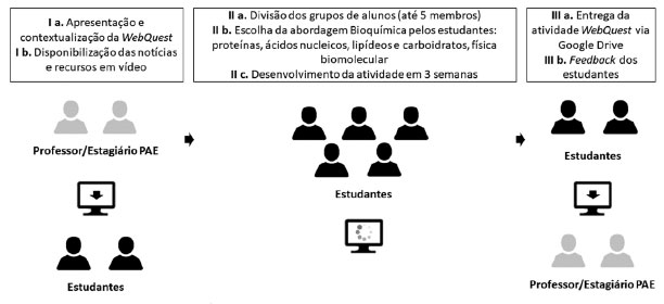 ![]() Figura 3. Representação esquemática das etapas da aplicação da WebQuest sobre Bioquímica e COVID-19 de forma remota