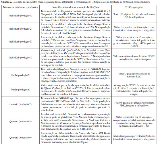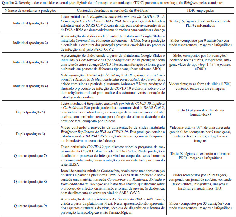 Os materiais produzidos, na plataforma Google Drive, foram submetidos à avaliação pelo docente, segundo os critérios previamente apresentados: estabelecimento de relações entre a Bioquímica e a COVID-19; pesquisa fundamentada na literatura científica; e criatividade na elaboração da resposta à atividade proposta. Resolução da WebQuest As produções entregues pelos estudantes como resposta à WebQuest foram analisadas na perspectiva da AMI, a qual, segundo a UNESCO, que desenvolveu o documento responsável pela popularização do termo: "É definida como um conjunto de competências que empodera os cidadãos para acessar, recuperar, compreender, avaliar, usar, criar e compartilhar informações e conteúdos midiáticos de todos os formatos, usando várias ferramentas, com senso crítico e de forma ética e efetiva, para que participem e engajem-se em atividades pessoais, profissionais e sociais".15 Em consonância com esta definição, a resolução da WebQuest possibilitou, inicialmente, que os estudantes se engajassem na realização de uma tarefa cujo tema permeia esferas pessoais, profissionais e sociais. Nesse sentido, ao traçar relações entre a Bioquímica e a COVID-19, eles se dedicaram a investigar, na perspectiva científica, um problema de ordem social21 (a pandemia), cujos impactos se deram no âmbito pessoal e profissional, evidenciado pela própria adaptação da disciplina em questão para o ensino remoto emergencial. A seguir, as produções dos estudantes são discutidas em detalhes, ilustrando o emprego de tecnologias digitais de informação e comunicação (TDIC) e as competências mobilizadas com a resolução da WebQuest. Produções dos estudantes: TDIC empregadas A variedade de TDIC empregadas para a resolução da WebQuest, que totaliza 9 produções, é mostrada no Quadro 2. Cabe ressaltar que este levantamento considerou a variedade de conteúdos e formatos - visuais e escritos - presentes em cada produção estudantil, de forma que uma mesma produção pode conter mais de um tipo de TDIC.