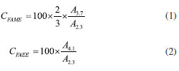 Standard solutions preparation To five aliquots of 10.0 g of biodiesel, the suitable amount of methanol and ethanol (spectroscopic grade, Sigma-Aldrich, St. Louis, MO, USA) were added in order to produce spiked samples with 0.05, 0.10, 0.15, 0.20 and 0.25% alcohol content (w/w). Solutions were homogenized by magnetic stirring for 5 min. Analytical solutions were prepared by dissolving 100 µL of pure sample and the spiked biodiesels in 500 µL of CDCl3 (99.5%, 0.1% TMS, Cambridge I. L., Andover, MA, USA). In each case, three independent experiments were carried out. NMR spectrum acquisition The free induction decays were obtained in a Varian Oxford 9.4 T (400.050 MHz for hydrogen, Varian, Palo Alto, CA, USA) with 32 scans (spectral width 6402.049 Hz, 5 s delay, 45o pulse angle) in triplicate and were edited in the MestReNova software.34 The fatty esters content (CFE) determination The fatty esters content (CFE) of pure biodiesel was determined from Equations 1 and 2, as described by Guzatto and coworkers,25,26 ![]() where: CFAME is the methyl esters content in methyl biodiesel; CFAEE is the ethyl esters content in ethyl biodiesel; A2.3 is the triplet at 2.3 ppm integration; A3.7 is the singlet at 3.7 ppm integration; A4.1 is the quartet at 4.1 ppm integration. Alcohol quantification For methanol quantification, from the spectrum of each standard solution, the area of the peak at 3.84 ppm was subtracted from the 3.48 ppm one. To the ethanol quantification, the area of the peak at 3.74 ppm was measured. In each case, the integral values were plotted versus the spiked alcohol concentration. Validation The recoveries (R) in each concentration level were estimated from Equation 3: ![]() where: CEXP is the experimental alcohol concentration; CS is the alcohol spiked concentration. The detection (DL) and quantification (QL) limits were determined from Equations 4 and 5, respectively,35 ![]() where: SE is the standard error obtained from the analytical curve; a is the inclination obtained from the analytical curve. The repeatability was estimated as the relative standard deviation (RSD) in each level of alcohol concentration (3 FID × 3 edition, n = 9).