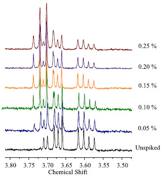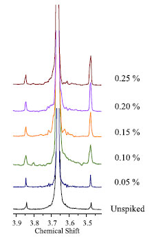 ![]() Figure 2. 1H-NMR spectra detail (Varian Oxford 400 MHz, CDCl3) of EtOH unspiked and spiked ethyl biodiesel (0.05 to 0.25%)