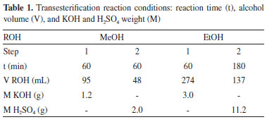 EXPERIMENTAL Biodiesel syntheses Methyl and ethyl biodiesels were obtained from a commercial soy oil by the transesterification double steps process (TDSP) procedures described by Guzatto and coworkers.25,26 The reaction conditions, that is, mass of the catalyst (M), volume of the alcohol (V), and time (t) are described in the Table 1. KOH (Dinâmica, São Paulo, Brazil) was used as the catalyst in the first step, and after that, H2SO4 (Vetec, Duque de Caxias, Brazil). In each step, M (g) of the catalyst were dissolved in V (mL) of the appropriate alcohol, MeOH (Êxodo, Sumaré, Brazil), or EtOH (Êxodo, Sumaré, Brazil). 200 g of the soy oil (Soya, Gaspar, Brazil) were transferred into a 1 L glass reactor equipped with a mechanical stirrer and a reflux condenser in a thermostatically controlled water bath at 65 oC, followed by the alkaline alcoholic solution. The reactional mixture was kept stirring (1000 rpm) for t1 min. After that, the acidic alcoholic solution was poured over the reaction mixture and stirred for an aditional t2 min at the same temperature. Thereafter, the mixture was transferred to a separatory funnel where the two phases, biodiesel, and glycerol, were separated. The denser phase, glycerol, was disposed of, and the biodiesel was washed with water (3 × 100 mL, 70 oC). Finally, the volatiles were eliminated under reduced pressure distillation.