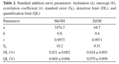 The standard addition analytical curves for the methyl biodiesel spiked with methanol and the ethyl biodiesel spiked with ethanol were obtained in the range from 0.05 to 0.25%. The parameters from the curves are presented in the Table 2, namely, inclination (a), interception (b), correlation coefficient (r), and detection (LD) and quantification limits (LQ) as the average of the three experiments. Both curves are presented in the supplementary material (Figures 13S and 14S).