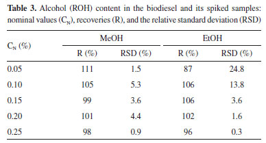 The correlation coefficient (r) in both cases is higher than 0.99 indicating the curve's linearity. ASTM 6751 stablishes 0.2% as the highest alcohol concentration allowed. The quantification limit (QL) was estimated equal to 0.069 and 0.079%, for the methanol and ethanol content respectively, therefore 2.8, in the first case, and 2.5 times, in the second, lower than the maximum alcohol content permitted. As expected, sensitivity, expressed by the inclination, is by far lower for the ethanol determination than it is for methanol. As explained before, the quartet was not integrated as a whole, but just its most unshielded peak. In addition, in the methanol determination, a methyl group peak was monitorated, which integral is proportional to 3H. In the ethanol quantification, however, a methylene group was tracked, which is proportional to 2H instead. From the equations, the alcohol content can be estimated by considering the response y, i.e., the integrated area, equal to zero and as a result 0.0005 and 0.006% were found for the methyl and ethyl biodiesels respectively, values that are below the detection limits (DL). The MeOH and EtOH contents in each spiked level expressed as the average of three experiments are presented in the Table 3. When the nominal values were plotted against the experimental ones, a curve with the equation y = 1.0000 was obtained, indicating the high similarity between them both. The determination coefficient (r2) was found equal to 0.9976 for both curves. Recoveries can be assumed as the accuracy of the method and are presented in the Table 3. The accepted values are dependent on the analyte concentration. For concentrations around 0.1%, recoveries are expected to be in the 97 to 103% interval.37 The 0.05% level is below the quantification limits and should not be considered. For methanol at 0.1%, and EtOH at 0.1 and 0.15%, recoveries were 106%, slightly above than the acceptable superior limit, but the complexity of the sample should be taken into consideration. Close to the alcohol maximum permitted level, it was found in range from 96 to 102%, assuring the accuracy for both methods.