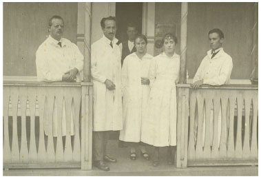 ![]() Figura 2. Alfred Schaeffer (o segundo, da esquerda para a direita) e seus assistentes no Laboratório de Análises Químicas de Minas Gerais, na recéminaugurada capital do Estado, Belo Horizonte. Década de 1910 (fonte: acervo Yara Schaeffer Novelli)