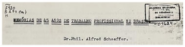 ![]() Figura 3. Recorte da autobiografia de Alfred Schaeffer em 1956, com suas memórias dos 45 anos de trabalho no Brasil (fonte: Biblioteca Academia Brasileira de Ciências)13