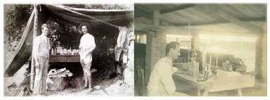 ![]() Figura 5. Alfred Schaeffer (de chapéu, foto da esquerda) e seus "laboratórios de campanha" em expedições pelo interior de Minas Gerais. Década de 1910 (fonte: acervo Rita Marques e Yara Schaeffer Novelli)