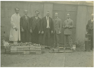 ![]() Figura 7. O presidente do Estado de Minas, Delfim Moreira (quarto, da esquerda para direita), assistindo a um experimento de Schaeffer (de jaleco branco) com o óleo de babaçu, no Laboratório de Análises do Estado em 1916 (fonte: acervo Yara Schaeffer Novelli)