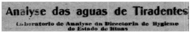 ![]() Figura 10. Recorte do periódico Minas Geraes, de 29 de março de 1916. Nesta publicação, Schaeffer apresenta o resultado da análise de água da fonte "Águas Santas" em Tiradentes (MG), concluindo que a "água analysada, absolutamente não se differencia, em sua composição chimica, de uma boa água potável; afasta-se, entretanto, da média das águas de nascente deste paiz, por apresentar temperatura mais elevada e radioactividade insignificante. Essas propriedades podem talvez, justificar, e mesmo assim em sentido muito limitado, o emprego therapeutico destas águas como thermaes, no próprio local, mas nunca a exportação como água mineral, destinada à mesa ou a fins therapeuticos"20