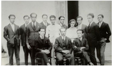 ![]() Figura 12. Alfred Schaeffer (sentado ao centro) entre docentes e estudantes das primeiras turmas de Química Industrial do Instituto de Química da Escola de Engenharia de Belo Horizonte, em 1923 (fonte: acervo Rita Marques)