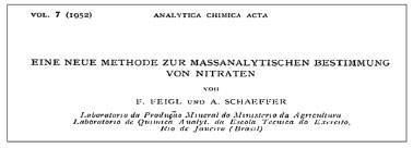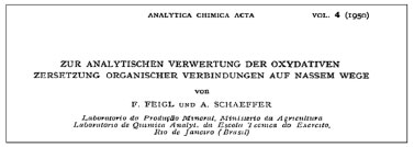 ![]() Figura 18. Frontispício de artigo de Fritz Feigl e Alfred Schaeffer publicado em 1950 em Anal. Chim. Acta (fonte: seção de Periódicos, Biblioteca Central, UFMG)