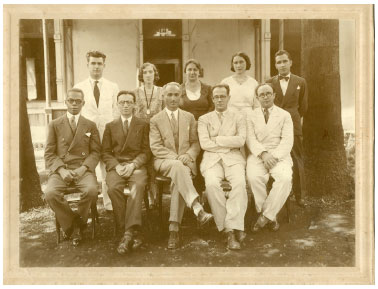 ![]() Figura 20. Alfred Schaeffer (sentado ao centro) e alguns de seus discípulos no Laboratório de Análises de Minas Gerais, década de 1930. Nesta época, o laboratório era dirigido por seu ex-aluno Annibal Theotônio (sentado ao seu lado direto). O químico alemão foi responsável pela montagem deste laboratório nos anos de 1910, com análises químicas pioneiras no Estado. Sentados, da esquerda para a direita, José Custódio da Silva, Annibal Theotônio Baptista, Alfred Schaeffer, José Baeta Vianna e, Aggêo Pio Sobrinho. Em pé, da esquerda para a direita, Detlef Surerus, Izabel Amador, Maria José Alvim, Olga Guimarães e Milton Mascarenhas (fonte: acervo Yara Schaeffer Novelli)