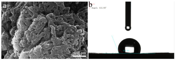 RESULTS AND DISCUSSION Materials characterization Scanning electron microscope (SEM) imaging was used to characterize the structure and dimensions of the polyaniline nanofibers created on the QCM substrate. As depicted in Figure 1a, the standard SEM depiction of the polyaniline nanofibers shows their consistent nanofibers, measuring around 100 nm in diameter. Figure 1b presents the outcome of the contact angle examination. When the contact angle between a water droplet and the surface of an object is greater than 90º, it indicates that the surface of the object is hydrophobic.39 The contact angle of QCM substrates coated with polyaniline nanofibers is 111.61º, indicating its hydrophobicity.