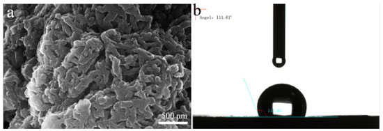 ![]() Figure 1. (a) SEM image of polyaniline nanofibers coated on the QCM substrate; (b) contact angle test result of QCM substrates coated with polyaniline nanofibers