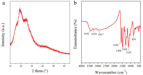 ![]() Figure 2. (a) XRD pattern of polyaniline nanofibers; (b) FTIR spectra of polyaniline nanofibers
