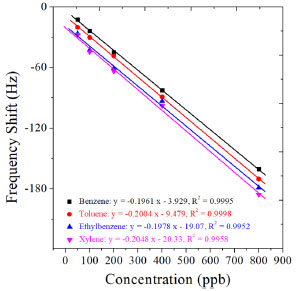 ![]() Figure 3. Fitting curves of polyaniline nanofibers based QCM sensor with different concentrations of benzene, toluene, ethylbenzene, and xylene
