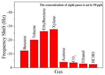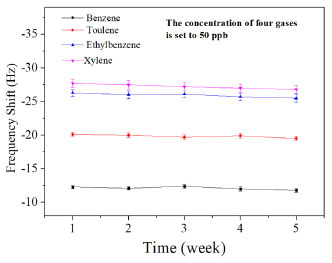 ![]() Figure 7. The frequency shift values of the polyaniline nanofibers based QCM sensor to four different gases, including 50 ppb benzene, 50 ppb toluene, 50 ppb ethylbenzene, and 50 ppb xylene, over a period of five weeks