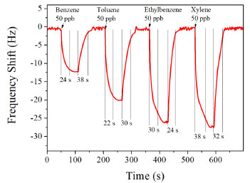 ![]() Figure 5. The polyaniline nanofibers based QCM sensor exhibits continuous response curves, as well as the corresponding response time and recovery time, for 50 ppb benzene, 50 ppb toluene, 50 ppb ethylbenzene, and 50 ppb xylene