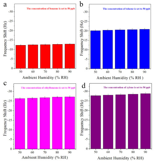 ![]() Figure 6. The frequency shift values of polyaniline nanofibers based QCM sensor to different gases within the relative humidity range of 50-90%, including (a) 50 ppb benzene, (b) 50 ppb toluene, (c) 50 ppb ethylbenzene, and (d) 50 ppb xylene