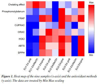 Many studies describe a clear linear correlation between the content of phenolic compounds and the reducing power of a plant extract.56-58 The results obtained in this work from E. uniflora extracts exhibit a consistent correlation between total phenolic content and reducing power across in all applied methods. EA pH 4, the richest in phenolics, was more efficient, with EU2 EA pH 4 standing out for yielding better results in all three methods (Table 6). However, this correlation did not exhibit a clear linear relationship, especially for the FRAP method (r: 0.536). This phenomenon can be explained by the synergistic effect between phenolic compounds and flavonoids, potentially contributing with comparable intensity to the ultimate reducing power. However, when the results for the EU2 specimen were analyzed, a slight difference in the performance of EU2 EA pH 8 extracts, rich in aglycones, and EU2 pH 4 extracts, rich in phenolic acids, could be observed when looked upon EU2 EA/MeOH extract, which is rich in glycosylated flavonoids, a drastic decrease in reducing power was noticed. This indicates that glycosylated flavonoids present in E. uniflora extracts may negatively influence the reducing power by FRAP method (r: -0.755). For the phosphomolybdenum and CUPRAC, a more linear correlation was observed between total phenolics and the reducing power of the extracts (r: 0.846 and r: 0.848 respectively). This positive correlation indicates that, concerning the assessment method of reducing power through the reduction of Mo6+ to Mo5+ and the reduction of Cu(II) to Cu(I), phenolic acids contribute more strongly than flavonoids. The same phenomenon was observed in the FRAP method, where flavonoid glycosides negatively influenced the reducing power, held true for the phosphomolybdenum and CUPRAC method (r: -0.857 and r: -0.523, respectively). A decrease in the performance of extracts obtained in EA/MeOH was noted, which may be correlated with the similar characteristic of flavonoids present in these extracts (Table 6). The presence of free transition metals in a biological environment favors the occurrence of Fenton-type reactions, where H2O2 is transformed into a hydroxyl radical (OH ). The formed radical is highly reactive and promotes the oxidation of biomolecules. Therefore, the chelation of transition metals, especially Fe2+, will interrupt this process, preventing oxidative stress.3 Chelating activity was assessed by the ability of compounds present in E. uniflora extracts to inhibit the formation of the Fe2+-1,10-phenanthroline complex, which exhibits an orange color. Neither extract was able to prevent the formation of this complex, indicating a lack of chelating capacity for Fe2+. This result contrasts with the findings reported by Cunha et al.,28 who identified an IC50 of 2430.9 µg mL-1 for a pitanga extract containing quercetin as its major component, collected at the Botanical Garden of Crato, Brazil. However, the IC50 value found for the positive control EDTA was the same, validating the experiment. Flavonoids are molecules known for their chelating ability with various metals.59,60 Studies61 describe this property as a possible mechanism through which flavonoids may act as adjuvants in the treatment of neurodegenerative diseases. The most common method for spectrophotometric detection of flavonoids involves the formation of a complex with AlCl3.17 Therefore, the observed discrepancy in this study may be linked to factors not clarified, providing evidence that metal chelation is not the primary mechanism by which E. uniflora extracts exert their antioxidant activity. Comparative analysis To enable comparison among specimens based on the performance of the selective extracts and their antioxidant activities, data normalization was necessary. Normalization is employed to enable the comparison of antioxidant activity data with different units. Following normalization, the previous quantitative values were scaled to the range between zero and one, where zero represents the lowest value and one represents the highest value found for a specific test. With the normalized data, a heat map was constructed, with extracts displayed in vertical rows and the now normalized values corresponding to each utilized method presented in horizontal rows (Figure 1). This methodology for comparing antioxidant activity data is outlined in the literature.20,62