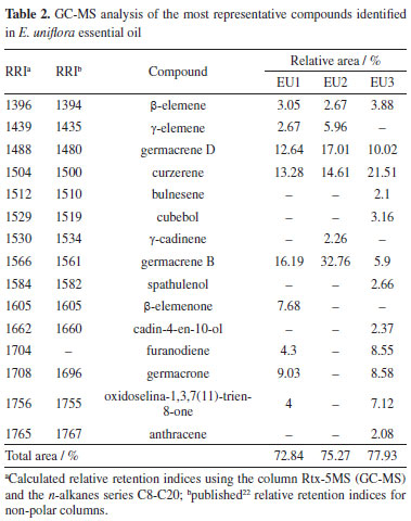 These results are in line with those reported for E. uniflora leaves growth in Crato, Brazil, considering the yield and sample solvent ratio used in an ethanolic extract that shown TPC of 75.6 mg GAE g-1 and for TFC 42.5 mg QE g-1, with an extraction yield of 1.07%.23 Another study33 reported values of 193.06 mg GAE g-1 and 28.64 mg QE g-1 for a hydroalcoholic extract with 10% MeOH. The essential oil of the leaves from three specimens of E. uniflora were submitted to GC-MS analysis to determine its composition. The volatile composition, relative area and retention time index are shown in Table 2.