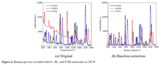 RESULTS AND DISCUSSION The Raman spectra of HAs The Raman spectra of the three samples obtained are shown in Figure 4. The samples were found to shift in the frequency range of 200-1800 cm-1. Figure 4a presents the source Raman shift spectra of the three HA isomers, revealing that each of the three spectra exhibited a notably severe baseline drift. Such drifts could adversely impact the subsequent theoretical spectral assignments. To address this issue, the raw absorbance spectra underwent a 5th order polynomial baseline correction, as depicted in Figure 4b. Despite the presence of some overlapping or close spectral scattering peaks, the Raman spectral scattering peaks of the three samples were markedly different from each other. The findings indicated that the HA isomers, which share the same molecular weight and possess similar structures but vary in the positions of the hydroxyl groups on the benzene ring, display distinctly different scattering properties. This approach also offers a novel technical avenue for the identification of the three samples.
