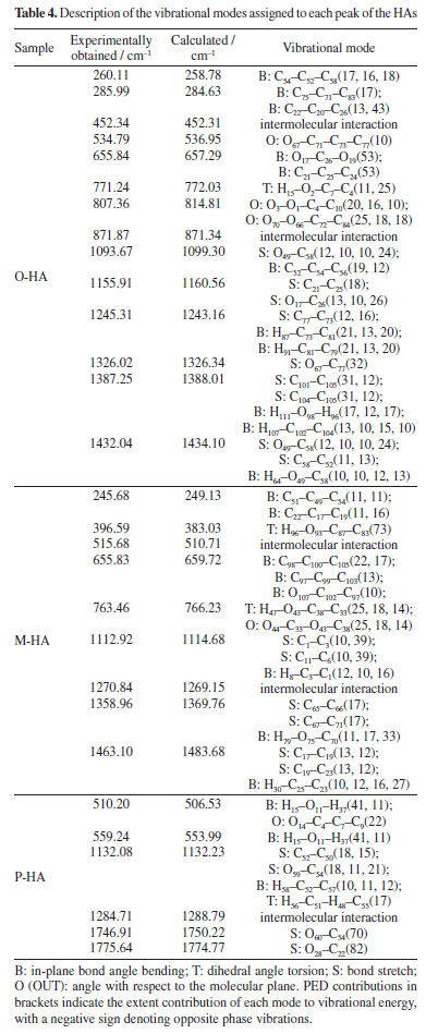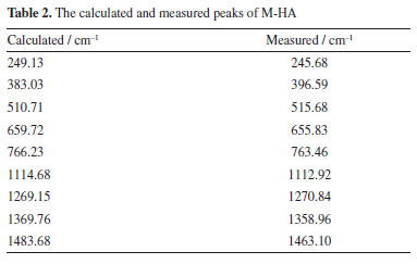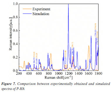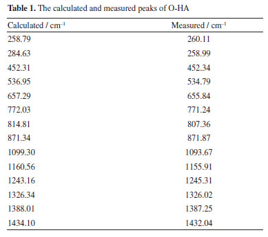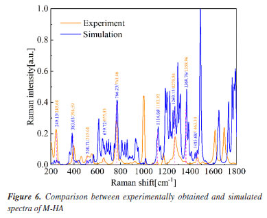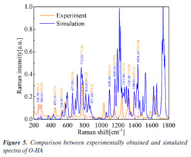The simulated Raman spectra of HA isomers Figure 5 presents the comparison between the experimental spectra of O-HA and the DFT simulated spectra of the O-HA cluster molecules. The correspondence between the calculated and measured peaks is shown in Table 1.