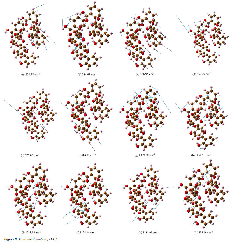 Figures 8a-8l presents a comprehensive illustration of the vibrational modes for the O-HA clusters corresponding to specific Raman shift peaks. The analysis of these modes, along with the data from Table 4, provides a detailed understanding of the vibrational behavior of the O-HA cluster. The mode at 258.78 cm-1 is primarily attributed to the in-plane bond angle bend of the C54C52C58 atoms. The peak at 284.63 cm-1 is mainly influenced by the in-plane bond angle bends of C75C71C83 and C22C20C26 atoms. The peak at 536.95 cm-1 is characterized by the angle between the vector and the plane involving O67C71C73C77 atoms. The 657.29 cm-1 peak is influenced by in-plane bond angle bends of O17C26O19 and C21C25C24 atoms. The 772.03 cm-1 peak is dominated by dihedral angle torsion and bond length stretch involving H15O2C7C4 atoms. At 814.81 cm-1, the mode is influenced by the angle between vectors of O3O1C4C10 and O70O66C72C84 atoms. The peak at 1099.30 cm-1 is primarily a bond length stretch of O49C58 atoms and an in-plane bond angle bend of C52C54C56 atoms. The peak at 1160.56 cm-1 is influenced by the bond length stretch of C21C25 and O17C26 atoms. The peak at 1243.16 cm-1 shows influence from the bond length stretch of C77C73 atoms and in-plane bond angle bend of H87C73C81 and H91C81C79 atoms. The peak at 1326.34 cm-1 is mainly a bond length stretch of O67C77 atoms. The peak at 1388.01 cm-1 is influenced by bond length stretches of C101C105 and C104C105 atoms and an in-plane bond angle bend of H111O98H96 and H107C102C104 atoms. Finally, the peak at 1434.10 cm-1 is characterized by bond length stretches of O49C58 and C58C52 atoms and an in-plane bond angle bend of H64O49C58 atoms. The blue arrows in Figures 8a-8l denote the direction of torsion. These findings, along with the results from Table 4, reveal distinct Raman shift peaks for the O-, M-, and P-HA isomers, which is fundamental for the identification of structurally similar organic molecules using the R-TDS technique. Figures 9a-9g presents the vibrational modes of the M-HA clusters corresponding to the Raman shift peaks at 249.13, 383.03, 659.72, 766.23, 1114.68, 1369.76, and 1483.68 cm-1. The blue arrows indicate the direction of torsion, aiding in the visualization of these modes. The vibrational mode at 249.13 cm-1 is primarily due to in-plane bond angle bends involving the C51C49C54 and C22C17C19 atoms. At 383.03 cm-1, the mode is mainly influenced by dihedral angle torsion involving the H96O93C87C83 atoms. The modes of the peak at 659.72 cm-1 are influenced by in-plane bond angle bends involving the O67C71C73C77, C98C100C105, and O107C102C97 atoms. The modes of the peak at 766.23 cm-1 are influenced by dihedral angle torsion involving the H47O43C38C33 atoms and the angle between the vector and the plane involving the O44C33O43C38 atoms. The modes at 1114.68 cm-1 are primarily influenced by bond length stretches involving the C1C3 and C11C6 atoms and in-plane bond angle bends involving the H8C3C1 atoms. The modes of the peak at 1369.76 cm-1 are mainly due to bond length stretches involving the C65C66 and C67C71 atoms and in-plane bond angle bends involving the H79O75C70 atoms. Lastly, the modes at 1483.68 cm-1 are influenced by bond length stretches involving the C17C19 and C19C23 atoms and in-plane bond angle bends involving the H30C25C23 atoms. These detailed observations, corroborated by the data in Table 4, offer insights into the vibrational characteristics of the M-HA cluster, essential for distinguishing it from its isomers in structural analysis. Figures 10a-10e presents a series of vibrational modes for the P-HA clusters that correspond to the Raman shift peaks at 506.53, 553.99, 1132.23, 1750.22, and 1774.77 cm-1. The blue arrows in the figures delineate the direction of torsion, aiding in the visualization of the vibrational motions. At the 506.53 cm-1 peak, the vibrational mode is primarily attributed to the in-plane bond angle bend involving the H15O11H37 atoms and the angle between the vector and the plane involving the O14C4C7C9 atoms. The modes of the peak at 553.99 cm-1 are predominantly influenced by the in-plane bond angle bend of the H15O11H37 atoms. For the peak at 1132.23 cm-1, the modes are shaped by the bond length stretch involving the C52C50 and O59C54 atoms, the in-plane bond angle bend of the H58C52C57 atoms, and the dihedral angle torsion of the H56C51H48C55 atoms. The modes of the peak at 1750.22 cm-1 are mainly influenced by the bond length stretch involving the O60C54 atoms. Lastly, the modes of the peak at 1774.77 cm-1 are primarily affected by the bond length stretch involving the O28C22 atoms. The comprehensive analysis of these modes, corroborated with the data from Table 4, provides a clear picture of the vibrational characteristics of the P-HA cluster, essential for distinguishing it from other structurally similar molecules.