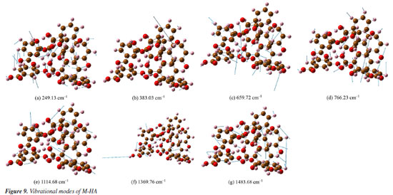 It is important to note that the peak at 1055.91 cm-1 in the measured spectrum does not have a corresponding calculated peak listed. Additionally, the calculated peak at 1160.56 cm-1 may correspond to the measured peak at 1155.91 cm-1, indicating a slight discrepancy between the calculated and experimental values. This comparison underscores the importance of experimental validation in theoretical modeling and the overall agreement between the two sets of data. Figure 6 presents the comparison between the experimental spectra of M-HA and the DFT simulated spectra of the M-HA cluster molecules. The correspondence between the calculated and measured peaks is shown in Table 2.